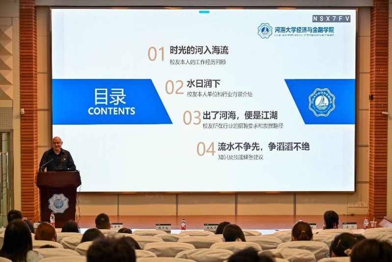 国际经济与贸易专业2007届赵宝龙员工,现任苏州文峰高级中学名誉副董事长、AME期刊出版集团办公室主任、杭州医康联科技股份有限公司董事、副总裁。他从自己丰富的职业经历着手,为同学们提供了“地低为海,人低为王的心态调整、内圆外方的品格修养”等四点未来工作的建议。他分享了本人单位和行业背景以及相关行业的发展路径,向在场的同学们展示了一个多元化的职业世界。“流水不争先,争滔滔不绝”,“把握大趋势、专业知识和国际化交流能力、合理利用资源”是赵宝龙员工对同学们给出的知识及技能储备建议。