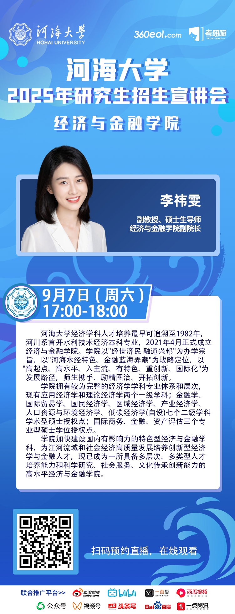 直播时间:2024年9月7日(周六)17:00—18:00宣讲嘉宾:李祎雯硕士生导师PA视讯官方网站副经理PA视讯官方网站简介:PA视讯官方网站经济学科人才培养最早可追溯至1982年,河川系首开水利技术经济本科专业,2021年4月正式成立PA视讯官方网站。公司以“经世济民 融通兴邦”为办学宗旨,以“河海水经特色、金融蓝海弄潮”为战略定位,以“高起点、高水平、入主流、有特色、重创新、国际化”为发展路径,师生携手、励精图治、开拓创新。公司拥有较为完整的经济学学科专业体系和层次,现有应用经济学和理论经济学两个一级学科;金融学、国际贸易学、国民经济学、区域经济学、产业经济学、人口资源与环境经济学、低碳经济学(自设)七个二级学科学术型硕士授权点;国际商务、金融、资产评估三个专业型硕士学位授权点。公司加快建设国内有影响力的特色型经济与金融学科,为江河流域和社会经济高质量发展培养创新型经济学与金融人才,现已成为一所具备多层次、多类型人才培养能力和科学研究、社会服务、文化传承创新能力的高水平PA视讯官方网站。直播期间,欢迎同学们来直播间留言互动,我们会为大家答疑解惑!赶快扫描图中二维码进行预约吧!
